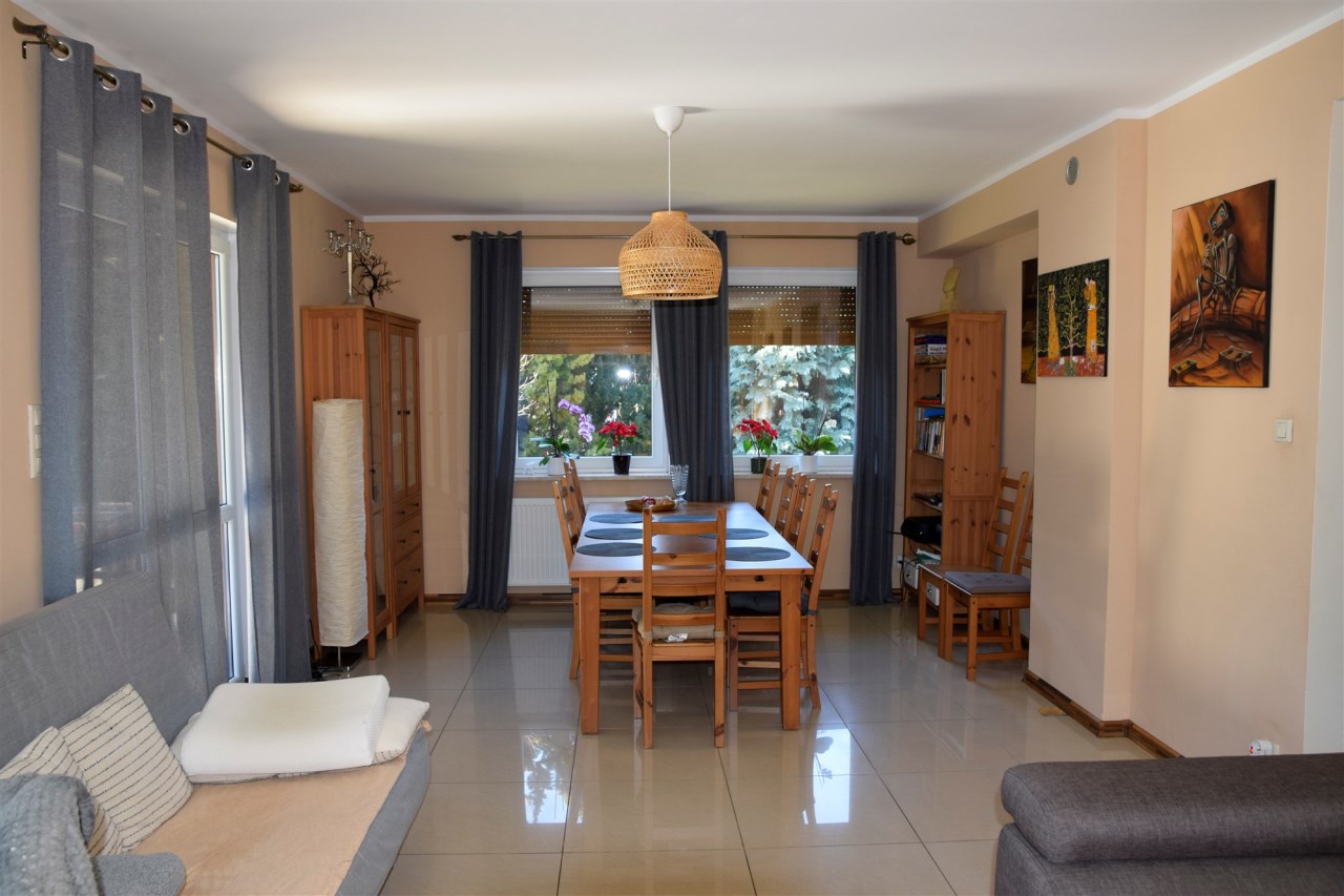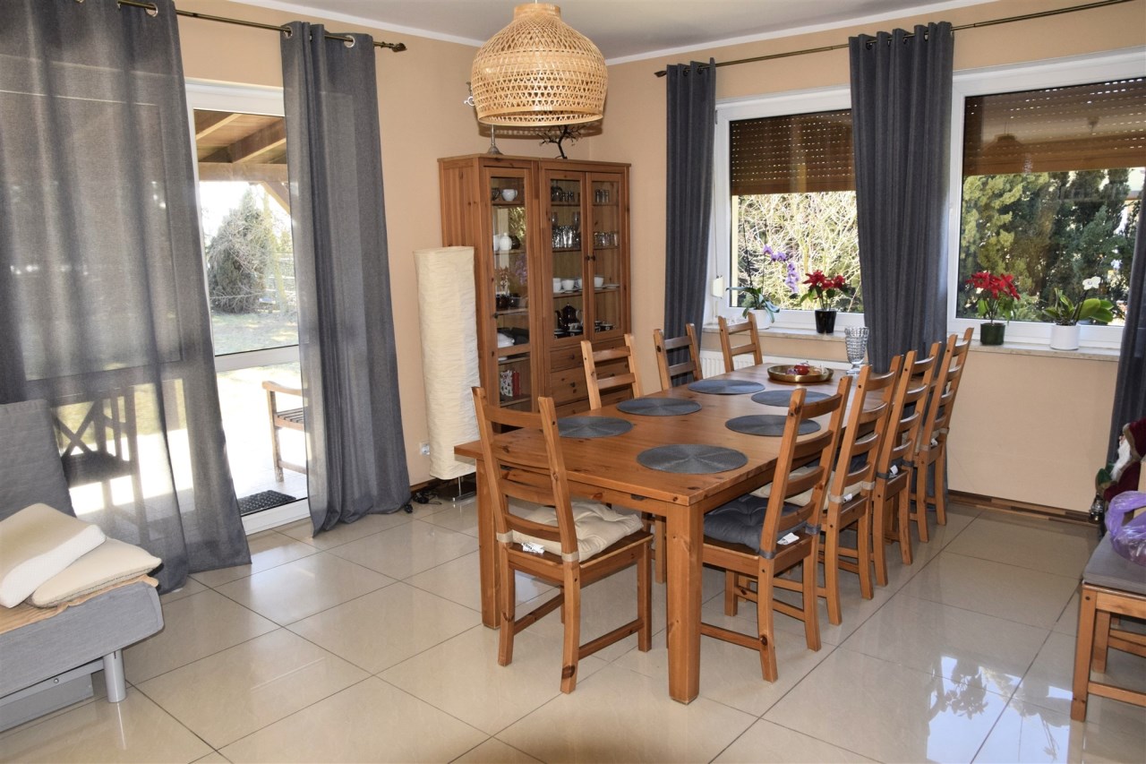 Przestronny, jasny salon z dużymi przeszkleniami oraz wyjściem na taras to idealne miejsce do wspólnego spędzania czasu. Naturalne światło oraz widok na zadbany ogród tworzą przytulną, a jednocześnie elegancką przestrzeń.